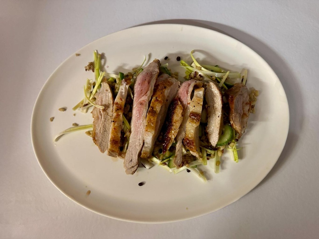 Secreto is a Spanish cut of pork from between the loin and the shoulder, apparently. It’s prized for its marbling and juicy texture. Ideally it should be from an Iberico pig, though ours was from a regular piggie. Consequently, I gave it slightly longer cooking of five minutes on each side. Though leaving it pink in the middle is suggested, I don’t think n this case that it worked as well as it might, If we can get some Iberico secreto, I may give it another go.
