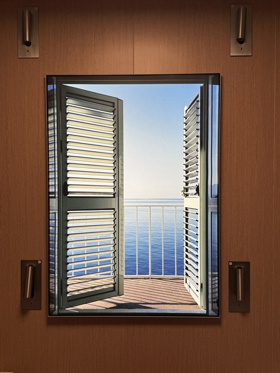 Our crossing was one with two nights and a whole day spent on board. We’d also lucked out with a window of fair weather so the potentially scary Bay of Biscay wasn’t; in fact as we’ve noted in the past, the Channel can be a little rougher. As well as missing out on the club class lounge, we had to make do with an inside cabin but, to be honest, the fake illuminated sunny view is actually much better than a genuine porthole.
