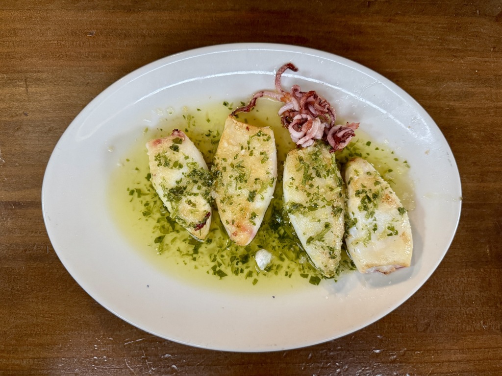 Casa Buisan was pleasant enough in an unscintillating sort of way. It was actually so calm that, if anything, it lacked a bit of atmosphere. Nonetheless, we enjoyed a couple of glasses of decent vino tinto to wash down our raciones. We chose a plate of Chiperones a la plancha [grilled squid] and some Berenjenas a la miel [Aubergines with honey]. Both were very good.