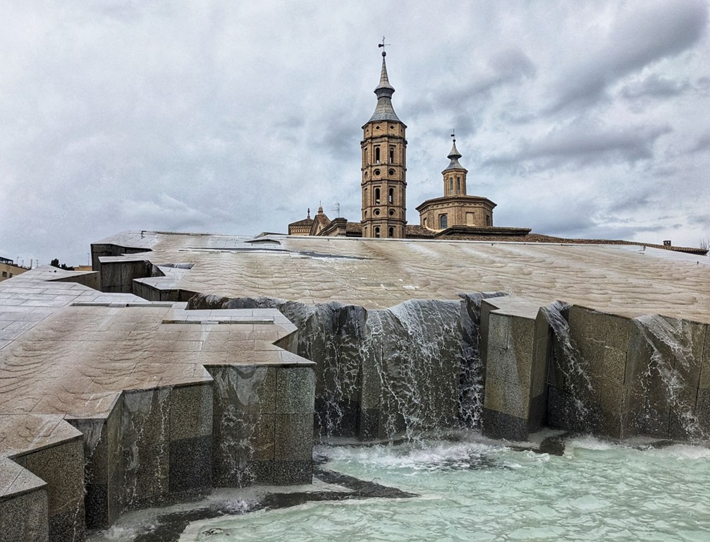To try and relieve ourselves of the crush, we wandered out onto a Roman bridge to get a more advantageous view of the Cathedral-Basilica de Nuestra Señora del Pilar, dedicated to Mary who (it says here) appeared on a pillar. In any event, it’s got a pretty roof.