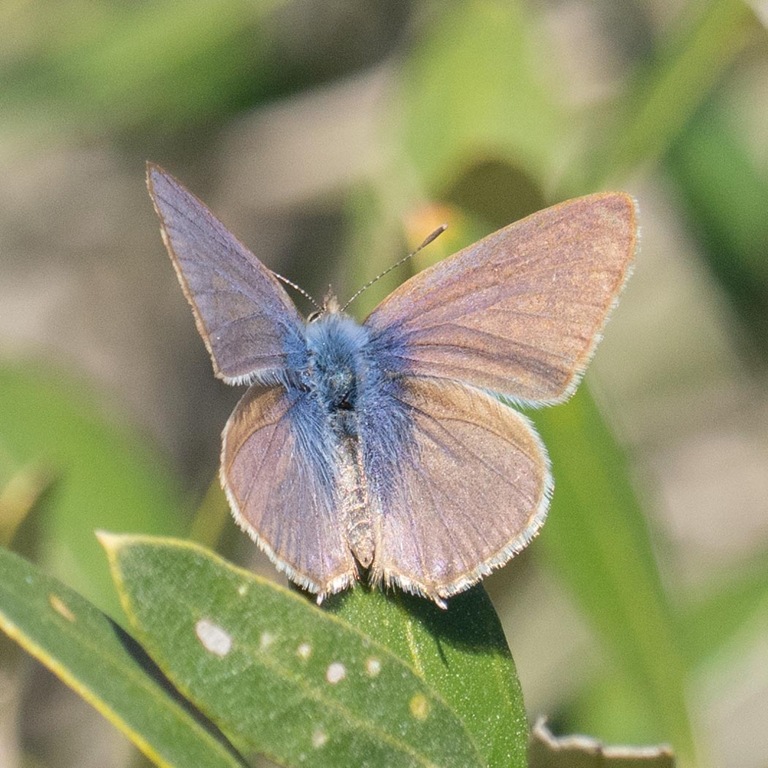Arriving at the summit we soon spotted a couple of butterfly species flitting about and occasionally sunbathing. Trees at the top shelter some of the summit from the worst of the wind. As expected, one customer was a Wall Brown (Lasiommata megera), which cooperated quite readily. There was also a small blue butterfly which was not keen on settling. Fairly quickly, I managed a shot of a Wall Brown and set about patiently waiting for the blue. One did eventually settle up in a tree so I could snag it. It was a Lang’s Short-tailed Blue (Leptotes pirithous) somewhat unusually displaying its topside. Happy camper.
